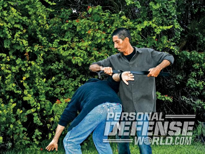 There are actually three ways to use the belt during an attack. First, wrap the non-buckle end around your hand a few times and, with large overhead strikes, swing the buckle toward your attacker’s head or weapon hand (naturally, if your attacker has a gun, just give him what he wants, unless you feel he will pull the trigger no matter what he demands) and create a figure-eight motion. This keeps the weighted buckle always moving and increases the chances of getting a solid hit. Second, bend the belt in half and with the folded end deliver a series of short whipping strikes that will stun your assailant and possibly allow you the time to escape. Finally, with some advanced training, hold the belt from each end and use the length to deflect oncoming strikes as you wrap the belt around your attacker’s arm or neck to gain control and ultimately subdue him.