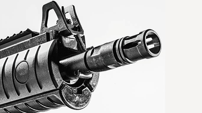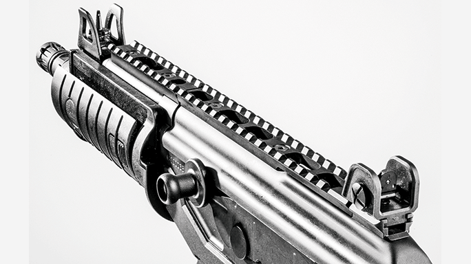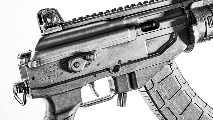 The details are variations on the Kalashnikov theme. Standard magazines rock in and out, but the polymer housing precludes the use of drums. While some may grouse that this rocking motion is tedious, the upside is that the resulting leverage will seat a magazine painlessly, even if it is topped off tight. The rigid, reciprocating, left-sided charging handle is markedly faster to manage than the right-sided AK counterpart, and the thumb-activated safety is a mighty improvement over the original.