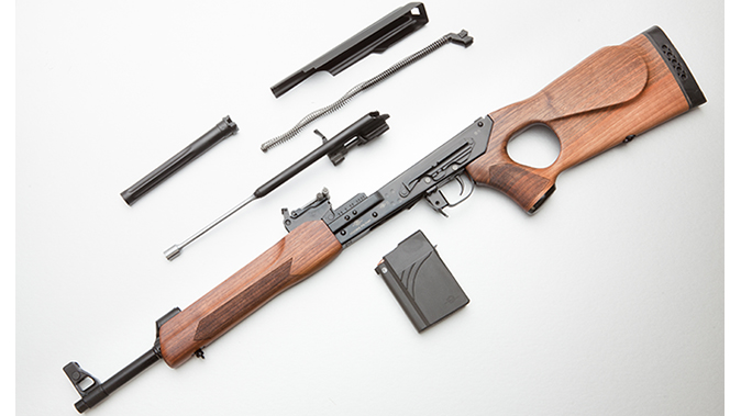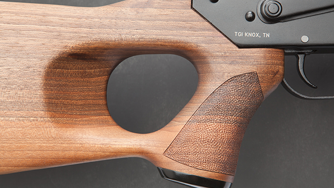 The straight-grained plain walnut buttstock is far superior to the AK military design that is too short, too narrow and does not provide a solid cheekweld for most shooters. On my test rifle, there were some slight gaps in the fit between the stock and receiver, but the stock has a well-fitted rubber recoil pad and a nicely shaped Monte Carlo-style cheekpiece to help you get your eye aligned properly behind a scope. The thumbhole stock is comfortable for right- and left-handed shooters, and you can raise the rifle and get on the sights quickly and naturally. Both the forend and stock have a light satin finish and use light stippling instead of checkering. The pattern did not stray from its borders. Non-detachable front and rear sling swivels are supplied, though they will only fit 0.5-inch-wide slings.