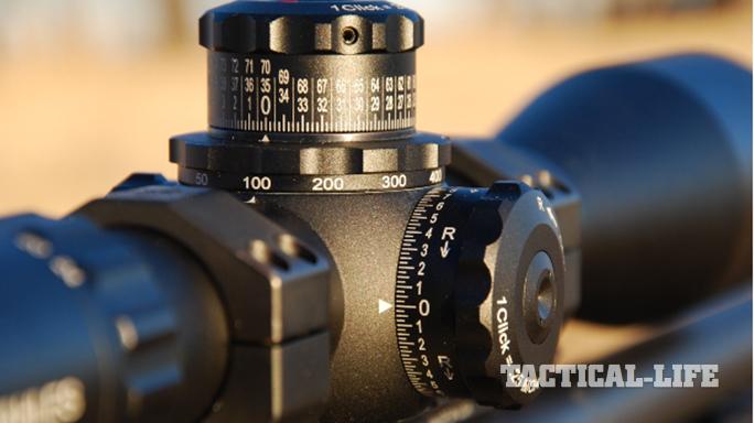 A 56mm objective lens is utilized up front and the scope body gracefully tapers down to a 34mm main tube. Ample mounting surface is available in front of the adjustment housing for optimal positioning of the front scope ring.
