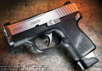 The Kahr PM9 in 9mm offers concealed carry enthusiasts a potent pocket pistol. It is shown with extended seven-round magazine, and a flush-fitting six rounder is also included.