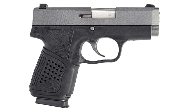 This Value Series CM45 in .45 ACP is the largest of Kahr’s “Micro” pistols. It is 5.79 inches long, 4.49 inches tall and has a slide width of 1.01 inches. The barrel is 3.14 inches long. Weighing 19.3 ounces with the flush-fitting magazine in place, it is also the heaviest of the CM-series Kahrs. This increase in size is due to the larger architecture of the .45 ACP cartridge and the fact that Kahr has kept the capacity of the CM45 the same as the CM40. As with the other three pistols described here, there is an optional extended magazine with a grip extension.
