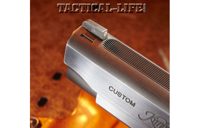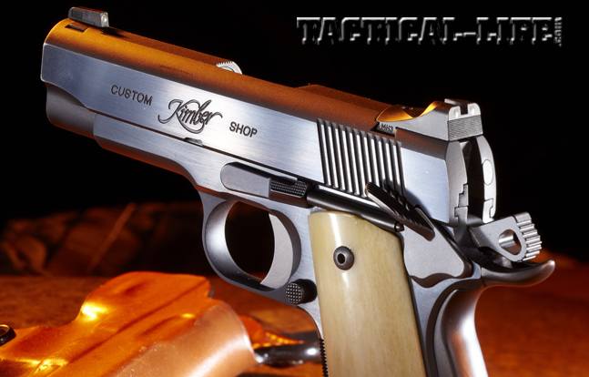 The Kimber is no lightweight and tips the scales at a robust 35 ounces. And, being a Commander-sized 1911, it has substantial muzzle rise even with Kimber’s full-length guide rod and hefty 22-pound recoil spring. Being a 1911 at heart, the Custom Carry Pro has all of the Colt’s inherent operational vices, but Kimber has managed to temper them all through hand-fitting each gun; the frame and slide are matched up early in production, with the slide having “Frenched” or beveled shoulders where it overlaps the frame to produce a smoother contour; from this point the frame and slide remain together throughout the entire custom shop process so that all parts are integrated and fitted specifically to that gun. Kimber never assembles or produces guns with parts that come out of a parts bin; everything is hand-fitted.