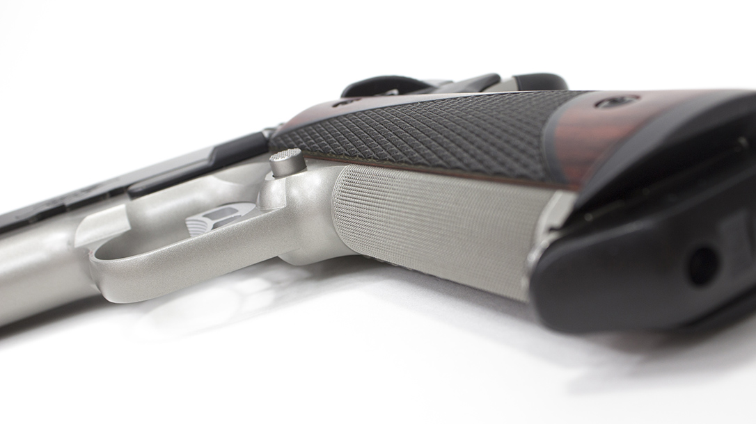 The stainless steel frame has an attractive satin silver finish and partially textured rosewood grip panels. You’ll also find 30-lines-per-inch checkering on the frontstrap and mainspring housing. For even more style, the pistol’s controls (minus the trigger) are black, including the extended, ambidextrous thumb safety, slide stop, magazine release and skeletonized hammer. This is a striking-looking gun. You get plenty of bling here.