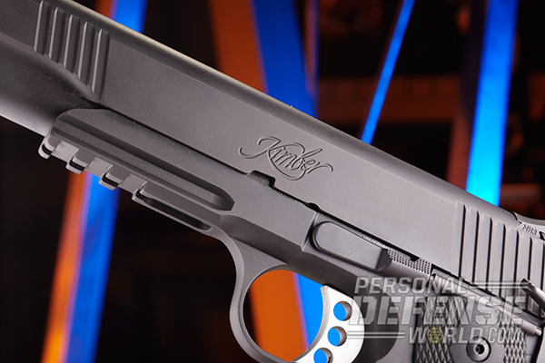 This RL II starts with a steel frame with a high cut front strap and 30-lpi checkering. The trigger is an aluminum, match-grade, standard-length trigger set to 4.5 pounds. As a Custom II pistol, it uses a firing-pin safety. Activated using the grip safety, it meets many requirements set forth by police agencies and even a few states. Among some 1911 users, this always lights a fire, but for me it’s never been an issue. I’ve owned at least half-a-dozen Kimbers with firing-pin safeties over the years, and none has ever failed. It does allow for a crisp trigger though, and most people never even notice that it’s there. Checkering is used on the mainspring housing, allowing for a solid grip. The mag well is beveled for positive magazine changes. A short rail is included to allow for tactical lights or other devices. An extended grip safety ensures a high grip, and black synthetic grips round out the lower receiver.