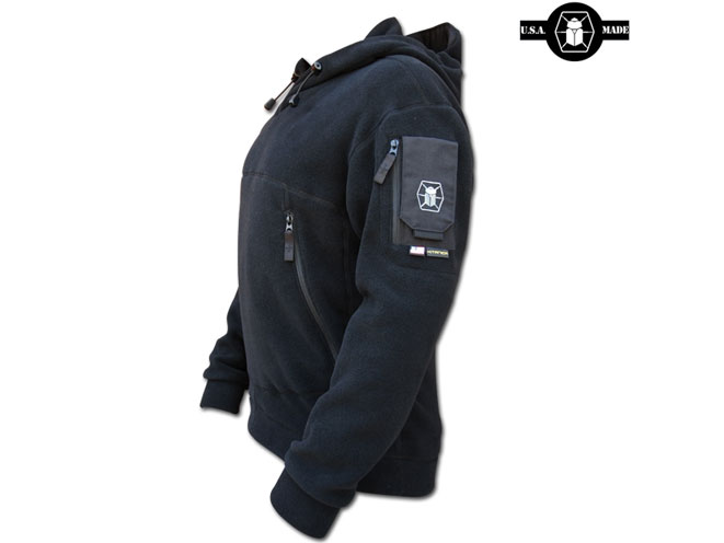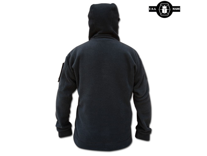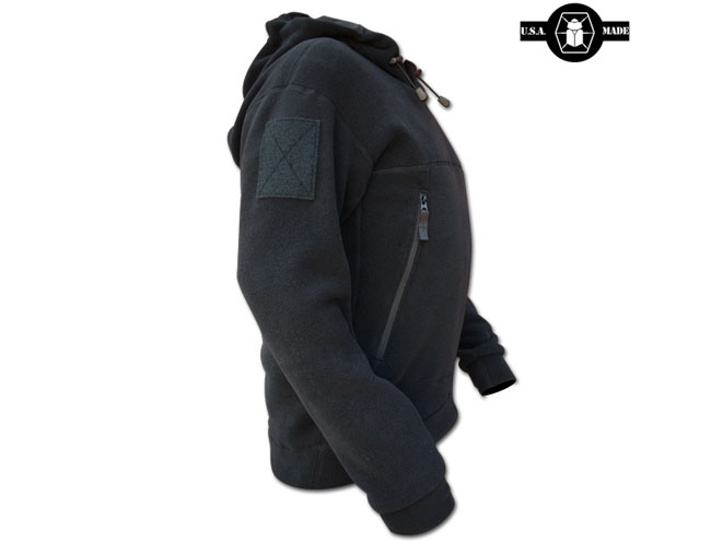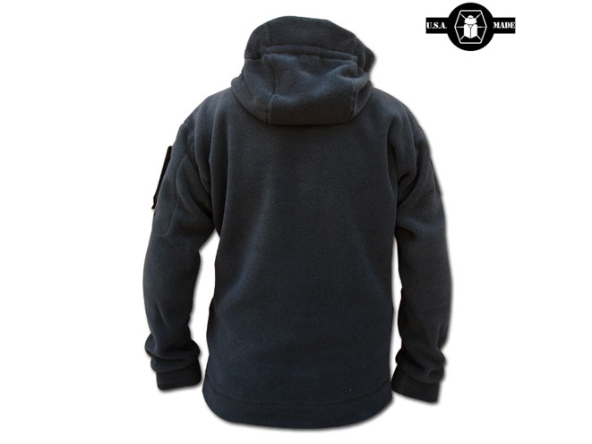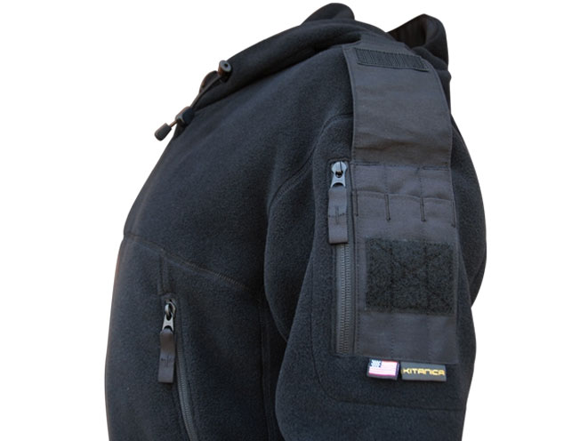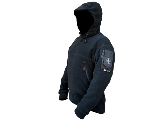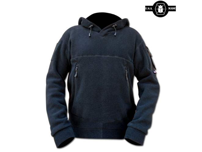 If you’re looking for a great functional outdoor hoodie, look no further than the Kitanica American Hoodie. As the product listing notes, this hoodie is constructed of breathable 200 weight fleece with hi-performance flat lock stitching and the hood has a stiffened brim that comes with an adjustable cinching shock cord. This hoodie also includes Kitanica’s covered pen tubes mounted on a zippered bicep pocket. The right bicep has a Velcro receiving patch.