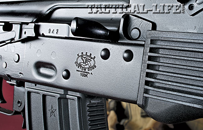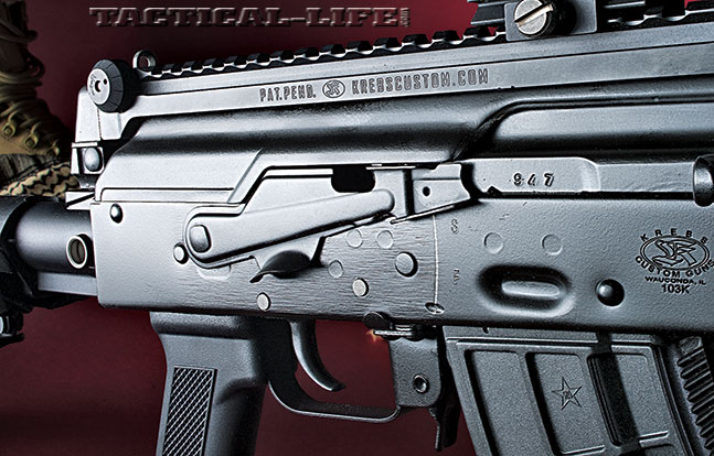 Krebs takes this already reliable system and improves it by smoothing the action, dehorning the edges inside and out, and adding a tuned U.S. trigger and safety selector. The Krebs custom safety selector, made from a single 1mm-thick piece of stamped steel, is indeed worthy of mention and a drastic improvement over the standard Russian selector. The new right-side-mounted safety selector features a cutout that serves as a manually activated bolt hold-open device. Normally, AK selectors have an extension at the front to operate them and require the user to remove his or her hand from the pistol grip to do so. But the Krebs Custom selector adds an extended tab at the rear bottom of the selector, which allows the shooter (if right-handed) to use the trigger finger to operate it without having to remove the hand from the pistol grip. This makes operation of the rifle by the user much easier.