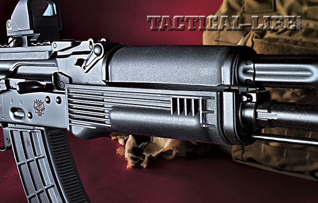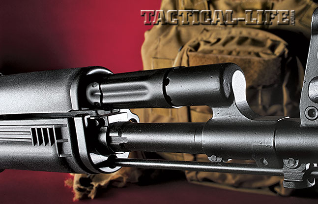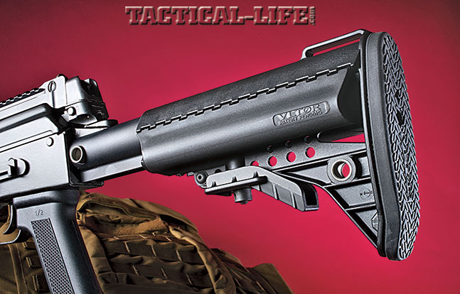 The handguard and pistol grip are standard, U.S.-made, black polymer parts. They are well executed and attractive while remaining true to the dimensions of the original. The buttstock, however, has been replaced with a complete unit from VLTOR that is specifically made for a stamped-receiver AK. An AR-style, aluminum receiver-extension tube allows for the use of any mil-spec collapsible stock. The receiver tube is very well built and sturdy.