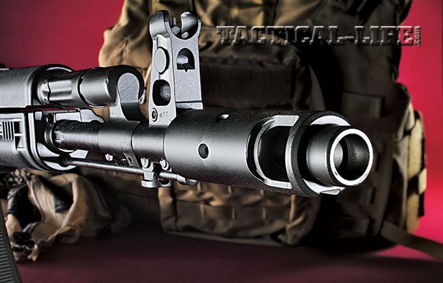 Three ports located at the back of the brake direct gasses upward and to the right to counter muzzle rise. In addition, the front of the muzzle brake features a distinct open split. Slots at the front of the chamber direct gasses backward, pushing the rifle forward and also reducing felt recoil. The final result of all of this is a brake that keeps the rifle on target for faster follow-up shots, noticeably reducing perceived recoil to the point that the 7.62x39mm cartridge feels closer to a 5.56x45mm—and there is very little muzzle flash. Underneath the barrel are an original bayonet lug and steel cleaning rod.