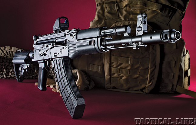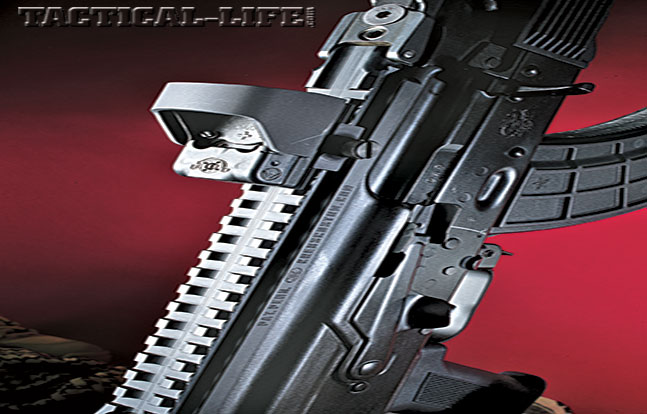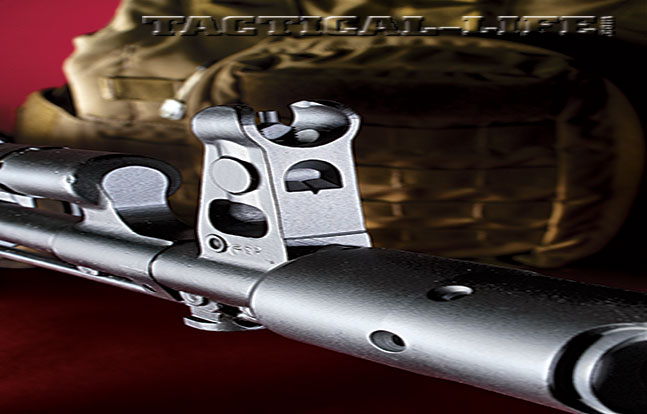 At the rear of the system is an AR-style peep sight with a small and large flip aperture that can be adjusted for elevation, as well as an AR-style windage adjustment knob. These iron sights are not only a huge improvement over the standard AK sights but also address another criticism of the AK: the short sight radius. The Krebs system extends the sight radius all the way to the rear of the receiver, a 60 percent improvement that increases the rifle’s accuracy potential. This system also allows for easy disassembly with an AR-style takedown pin at the rear, which allows the entire rail to rotate up for removal of the receiver cover. Standard AK disassembly is then possible for routine maintenance.