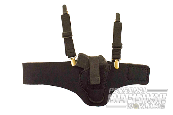 A popular option for women is the Flashbang from Looper Law Enforcement. It is essentially a Kydex clamshell that your compact pistol snaps into and it has a strap that hooks over the center of the bra. The clamshell then tucks up under the front edge. To access your gun, you reach up under your top and pull it straight down. Femme Fatale has an alternative to the Flashbang — it’s a corset, worn around the midsection, just below the bra line, that has a center pocket in the top. Instead of coming up from below, like the Flashbang, you come down from the top to reach your gun.