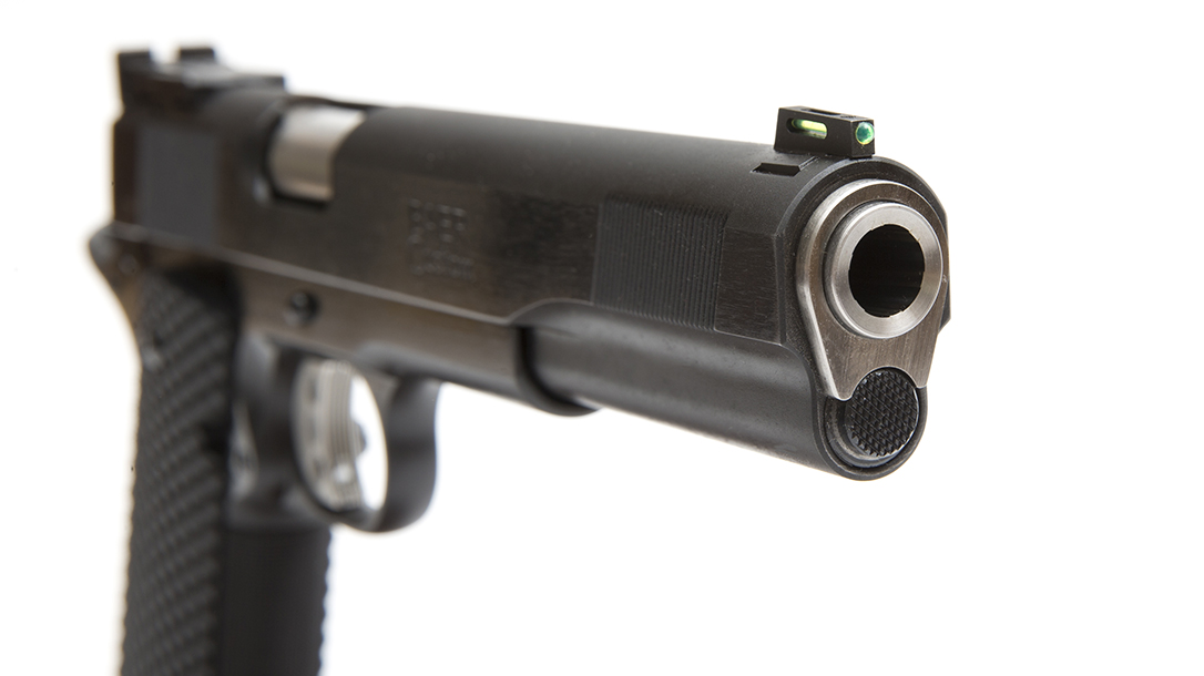 The pistol includes a fiber-optic front sight along with an adjustable, low-mount LBC rear sight. The slide has a blued finish. Baer serrates the slide at both ends for those who like the look and/or the ability to press-check the weapon. It also comes with Baer’s Speed Trigger, tuned for a 4-pound pull.