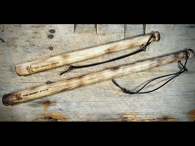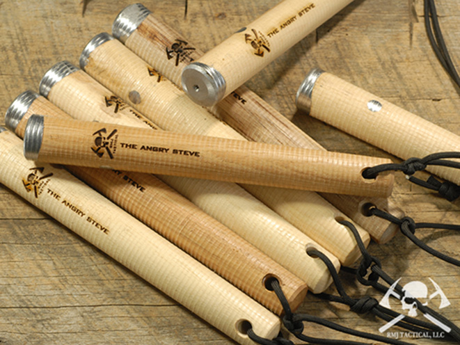 The Pocket Thumper is handcrafted from Tennessee hickory and is 9 inches of old-school persuasion. The tool also features a historically important decorative motif. In the 18th and early 19th centuries, pewter was often used as a decorative element on tomahawks, knives and even flintlock rifles. The craftsman would carve a design into the wood using a through hole and undercuts to help keep the future inlay in place. The wood was then wrapped with leather and molten pewter was poured in, filling the holes and designs. This allowed the maker to secure pieces without any adhesives. Other variants, including the Angry Steve (next photo), are available from RMJ Tactical.