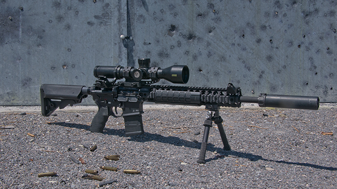 This rifle ran flawlessly with and without the SOCOM556-RC2 suppressor. With the suppressor in place, the ejection pattern didn’t alter much, and excess gas was kept to a minimum. This setup worked well for prone shooting with lower and slower round counts. Working the square range with fast split times and higher round counts, the WarComp would be my preference. The suppressor caused the point of impact to shift vertically 2.5 inches with the 69-grain TMKs—there was no side-to-side movement.