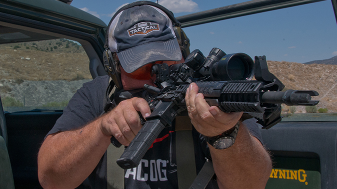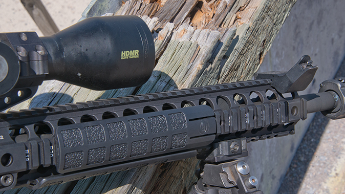 Previous MRP testing yielded excellent accuracy results, prompting the second configuration. I replaced the LMT sights with a set of offset Dueck Defense RTS sights. I also added a Bushnell 3.5-21x50mm HDMR scope using a Horus TReMoR 2 reticle in an Alamo Four Star mount. Extensive experience with this system has yielded excellent results to the limits of the 5.56mm NATO cartridge. I used SureFire’s SOCOM556-RC2 suppressor for much of the long-range testing. For prone shooting, I used an Atlas bipod and Magpul’s 20-round PMAGs.