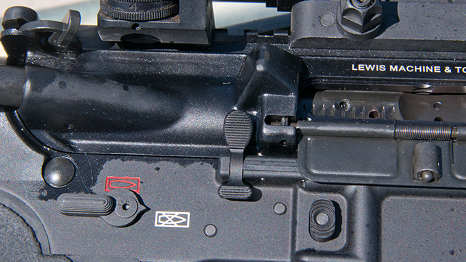 While ambidextrous lowers are starting to become common on various sporting and competition rifles, LMT’s MARS-L is one of the most intuitive I’ve used to date. On the left side you’ll find a standard bolt stop and safety as well as a new magazine release that’s placed a little lower than the right side’s. A small guard protects it from inadvertent activation. The right side hosts a bolt catch/release. While other designs only release the bolt, this version allows you to lock the bolt to the rear by pressing the button, eliminating the need to remove your control hand from the rifle. The safety levers are mirrored with clear pictograph markings on both sides.