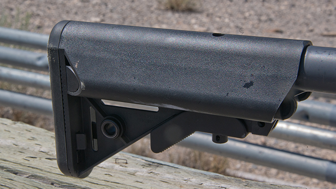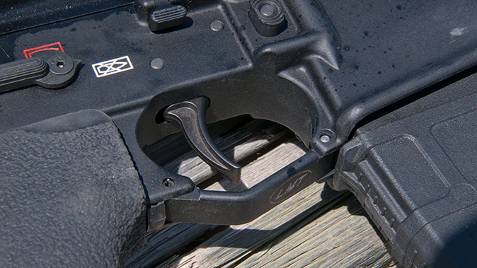 LMT’s collapsible SOPMOD stock is installed on the mil-spec buffer tube. More features include the rubber pistol grip and extended triggerguard. Rounding out the lower is LMT’s excellent two-stage trigger.