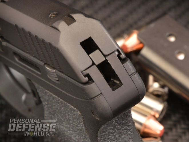 There are no manual safeties and the trigger is DAO with a short 0.5 inches of travel and a substantial 6-pound trigger pull. In terms of familiarization, the flush-profile hammer is recessed in the back of the slide and can only be seen in the ready-to-fire, semi-cocked position (the action has been cycled). If the gun has not been cycled, the hammer is not visible at the back of the slide, and there is a loaded-chamber view port at the breech showing the rim of a chambered .380 ACP cartridge.