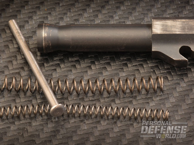 Part of the standard Galloway upgrades is a new recoil spring and stainless steel guide rod. The new guide rod is more durable, as is the heavier 13-pound dual recoil spring made to Galloway’s specifications. The Galloway guide rod has a 30-degree bevel machined into it, which is then hand polished to create a smooth radius across the back of the head that firmly seats the guide rod into the barrel’s camming lug notch. The heavy-duty spring also has a longer service life and eases some of the muzzle flip that the standard recoil spring permits.