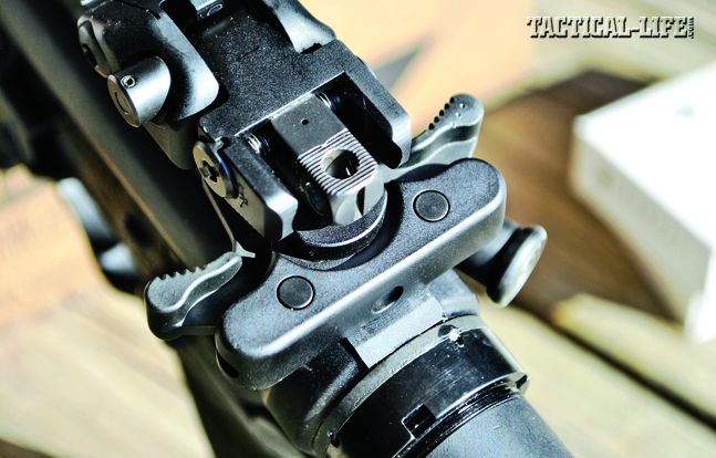 The Six8-UCIW utilizes the shortened buffer tube and specifically designed buffer introduced with the UCIW series. When combined with LWRCI’s proprietary stock, the Six8-UCIW collapses to a mere 24 inches. A free-floated Picatinny rail provides an ample mounting area for accessories. An LWRCI folding foregrip comes standard on the weapon. The Six8-UCIW is also equipped with the company’s excellent backup iron sights. The rear sight is a square post with two different aperture diameters that can be selected by rotating the post. The front sight consists of a post that is adjustable for elevation and features a semi-circular guard that is reminiscent of the sights found on an MP5.