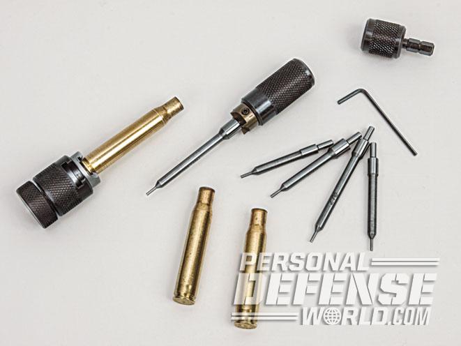 All you do is install the appropriate pilot into the trimmer head, lock a piece of brass and its shell holder in the trimmer body, and insert the guide into the cartridge case until the cutter head is contacting the case mouth. Turn the cutter head by hand, cutting down the brass until the pilot bottoms out inside the case. You can’t trim too far because the pilot stops you at the correct case length. And, if you want to save the elbow grease, the system comes with an adaptor to mount the cutting head on a power drill. Trimming cases doesn’t get much easier than this.