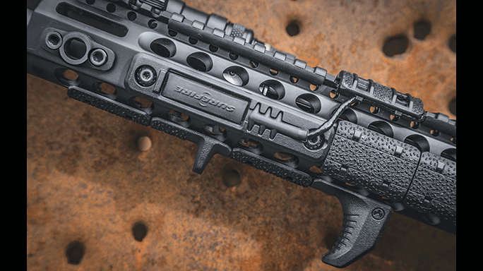 For anyone running a SureFire flashlight, Magpul also offers a tape switch mounting plate. The mounting plate allows you to affix a SureFire ST pressure pad to the handguard, eliminating problems with switches coming loose during use.