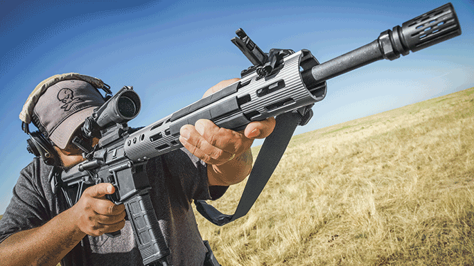 One of the rifle accessories that has become very popular over the last two decades is the foregrip. Foregrips on rifles can take several different forms, and the most popular seems to be the vertical grip. A vertical foregrip most often attaches to the 6 o’clock position on a handguard and extends toward the deck at a 90-degree angle. Magpul offers the M-LOK MVG vertical foregrip for this purpose.