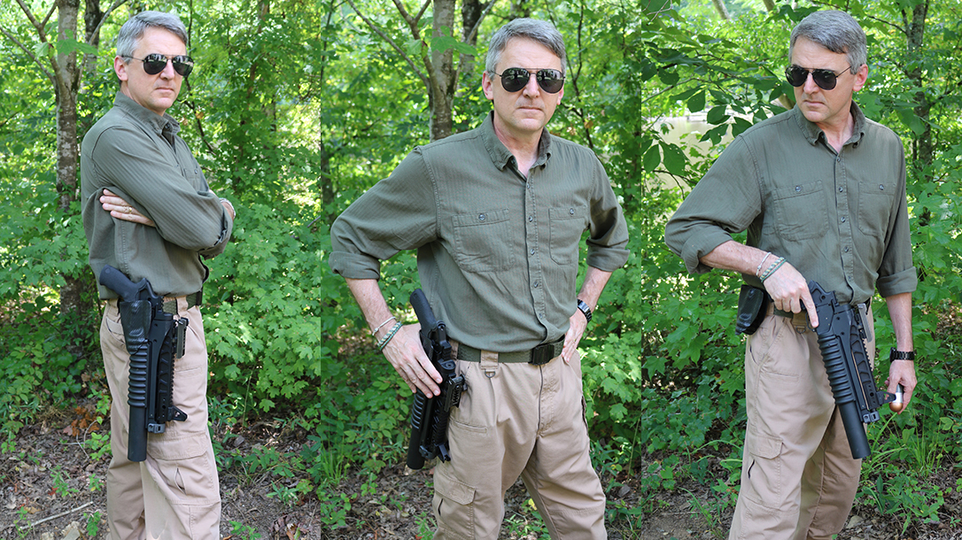 So, after obtaining some of these rounds for testing, my goal was to make the M203 ready for carry. Thankfully, my friend Dennis Todd figured out how to pack one comfortably. He and a buddy designed a Kydex carry rig for the M203 that totes the gun on the hip while allowing fast access. Dennis is a fixture in the uniquely American world of advanced tactical gun collecting, and he has a gift for such stuff as this.