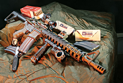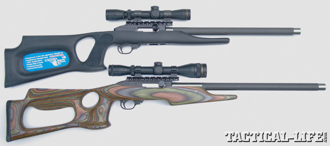 The bolts, which are made of hardened, 4140 steel, are also machined to tighter-than-OEM tolerances. Because the specs for optimal accuracy in a semi-auto .22 LR are different from those for a bolt-action rifle, this gun employs a Benz chamber, which essentially is a chamber whose front half is reamed to slightly tighter tolerances with regard to diameter and throating and whose rear half is reamed more generously, relative to SAAMI specs, so as to better meet the optimal conditions for a semi-auto in terms of feeding, chambering and extraction. In short, the chamber’s snug cartridge-embrace up front serves to better align the bullet to the bore axis and shorten its “jump” for best accuracy, all the while ensuring more reliable semi-auto operation with all brands and types of ammo. The magnum version, however, employs a standard SAAMI spec chamber. Both guns come with the same rotary magazines and trigger groups as furnished on the respective Ruger guns. And why not, when the receivers are exactly the same as far as all working parts are concerned?