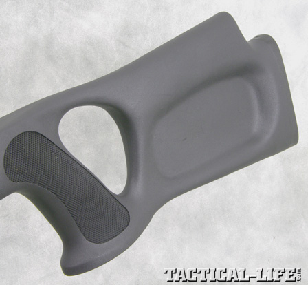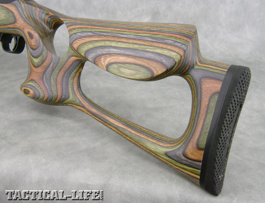 The stocks on these guns are quite different from one another. The one furnished with the LR version is an injection-molded ambidextrous thumbhole of polypropylene with “fiber additives” for extra strength and rigidity. Each side is a mirror image of the other. Comb height is designed for scope compatibility, and there’s a palm swell on the grip. The Barracuda stock on the magnum version consisted of a green/gray/brown color combination; it’s also a thumbhole, but that’s about the only characteristic they share. Note, the barrels are partially bedded—the LR for the first 2.5 inches of barrel and the magnum the first 4 inches. From there to the muzzle both barrels are free floated. And the laminated stock is definitely not ambidextrous, but boy it sure feels good if you’re right-handed!