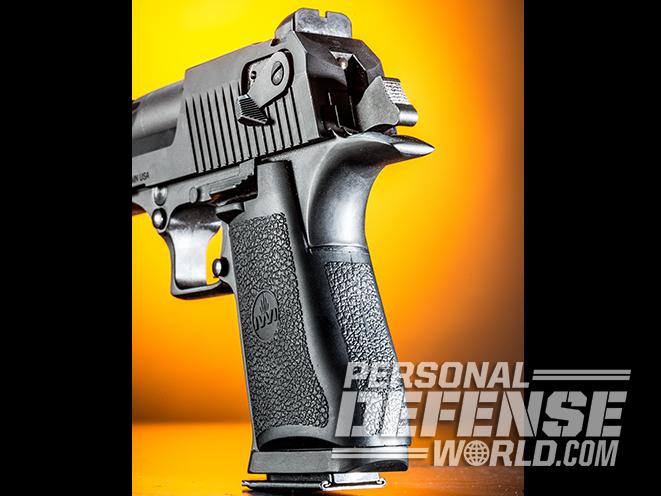 While the grip shape is determined by the huge magazines that hold the fat cartridges—seven .50 AE rounds or eight .44 Magnum rounds—its girth spreads the recoil over a larger surface area, and there are no sharp edges to bite the shooter. The frame also possesses a large tang or beavertail to protect the shooter’s hand from the slide.