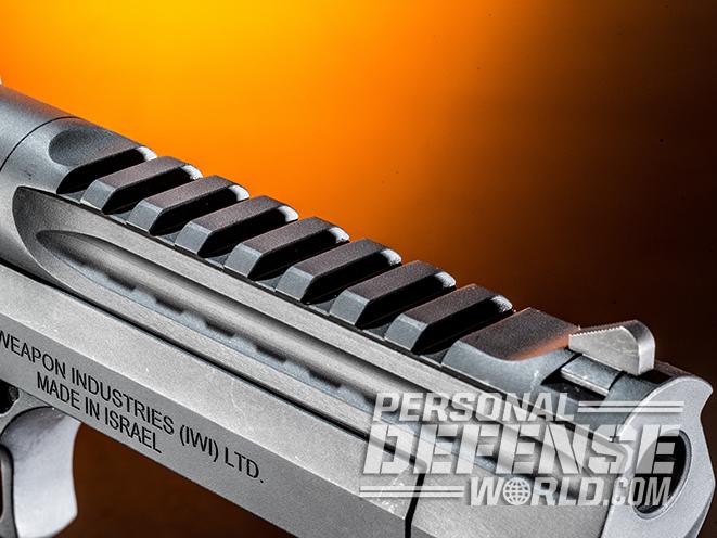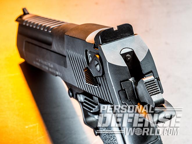 The latest Desert Eagle features a serrated hammer spur, a squared rear sight notch and an ambidextrous, slide-mounted thumb safety.