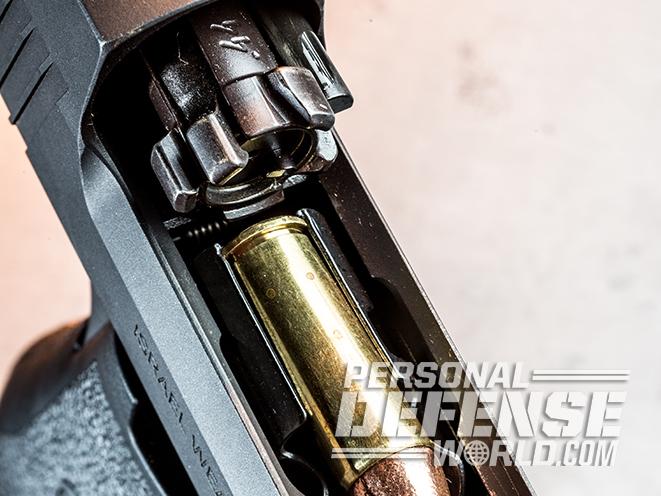 The Desert Eagle uses a rotating bolt lockup that is reminiscent of the AR-15/M16 family of weapons. The bolt head locks into the barrel extension to provide a solid lockup at the moment of cartridge ignition. Once the bullet has left the barrel and the pressure has dropped, the bolt unlocks to cycle the action. It is a hearty system developed to handle the significant power of the .44 Magnum and .50 AE cartridges, and the twin recoil guide rods have two springs each to slow the slide’s velocity and return it to battery.