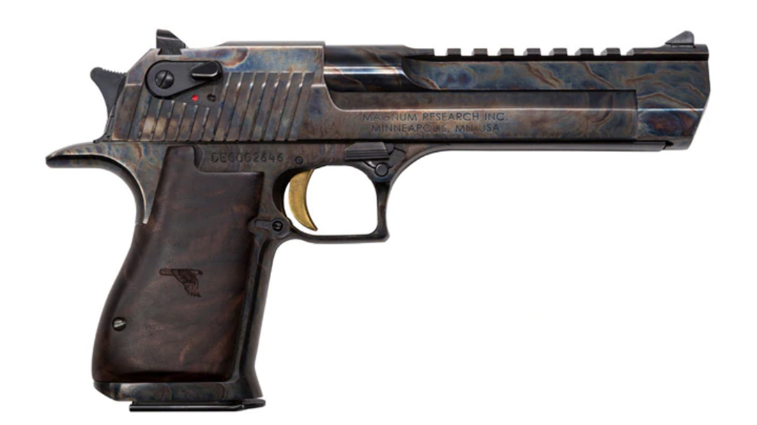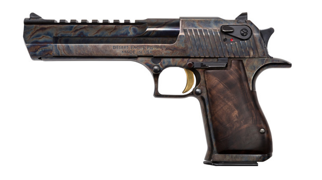 There have been three major iterations of the Desert Eagle: the Mark I in .357 and .44 Magnum in 1983; the Mark VII in 1989 with slight redesigns; and the current Mark XIX developed in the 1990s to allow users to switch between .357 Magnum, .44 Magnum and .50 Action Express barrels. The Mark XIX comes in a wide range of finishes that run from stainless through black oxide, tiger striped, burnt bronze, titanium gold, chrome, satin nickel, polished nickel and 24-Karat gold. And now there’s a color-casehardened Magnum Research Desert Eagle.