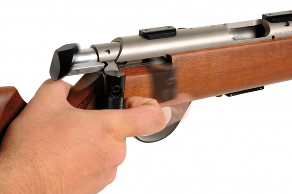 With its straight-pull action developed primarily for Biathlon competition, the 1727 sporting rifle from Anschutz is quicker to cycle than any rifle with a traditional hand-operated mechanism. You never take the rifle from your shoulder or your eye from the sight. Use your index finger to flick the bolt open, a touch of your thumb to close it. The two-stage match trigger adjusts down to 1 ¼ pounds. The checkered walnut stock, of European profile, is well fitted, nicely finished. Anschutz rifles are known for fine accuracy (my 1413 won many matches), and this repeater in .17 HMR will shoot half-minute groups. The 1727 joins a long line of match and sporting rifles.