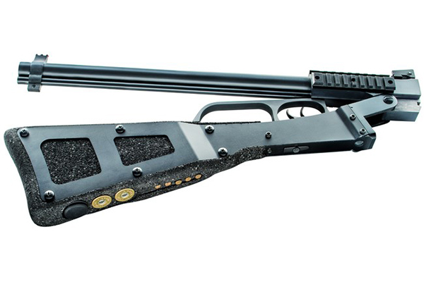 This O/U hinged-breech survival rifle/shotgun has a .22 barrel under a 20-gauge barrel. It collapses into a compact (18 ½-inch) package. Compartments in its synthetic stock hold cartridges and a cleaning kit. With an under-lever opener and double triggers, this combination gun is easy to operate with cold fingers. Rails just in front of the breech let you mount accessories, from scopes and red dot sights to auxiliary lights. Rugged iron sights are adjustable.