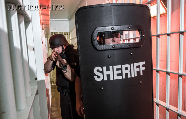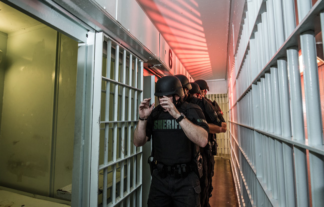 The Critical Emergency Response Team (CERT) works within the jail to manage situations ranging from typical shakedowns to cell extractions and riots. They are armed with heavy-duty less-lethal weapons and are specially trained in Krav Maga. Team Commander Lieutenant Rick Godan filled me in on the CERT acceptance process, which consists of an interview and psych evaluation. Once a candidate passes that, it’s on to military-style training for a week at Camp Atterbury, a military base located in southern Indiana. Then another 60 hours of training begins, designed to bring the team members up to speed on ground fighting, handling prisoners and weapons training. CERT operators also have an additional eight of hours of training per month.