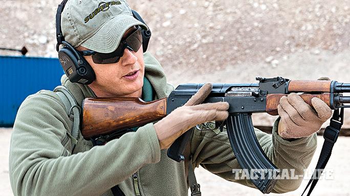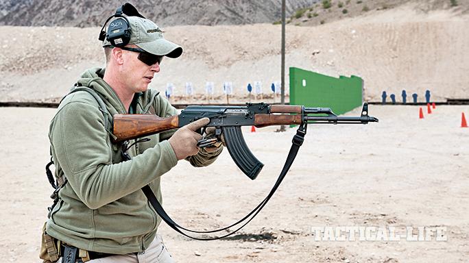 After lunch we started in on reloading. To keep things simple, we were encouraged to use only the speedload. We covered tactical loads, but the idea was to keep the guns loaded and running for the remainder of the class. Several methods for running the bolt were covered. With a standard AK, the bolt-running method depends on the situation and your gear—know all the methods and use what works best for you. Once everyone could keep the rifles fed, it was time to work on positions. Rounds were fired on steel at 50 and 100 yards from the prone, seated, kneeling and squatting positions, and we had the means to tactically move between the positions. Everyone left the range with zeroed rifles and simple operational skills. Daytime shooting ended with full-auto AK-47 familiarization. We each ran a “one 3-round magazine, one trigger press” drill. It not only was fun, but also showed how difficult controlling a 7.62mm AK on full-auto can be.