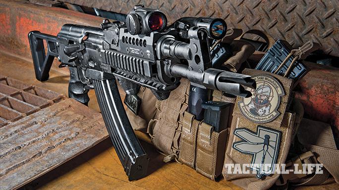 My AKM started as a Draco pistol with an 11-inch barrel. Blackheart International added an AR stock and licensed it as an SBR. I replaced the stock with a DPH Arms solid aluminum unit. The same Midwest Industries forend is utilized, this time with an Aimpoint Micro T-1 with a 2-MOA dot that offers truly co-witnessed iron sights. A tritium front sight and Krebs ghost-ring rear sight were added. The AKM’s coating is original, with regular touch-ups made via canned spray paint. Throughout the course I wore Haley Strategic’s new chest rig, which accommodated both AK-74 and AK-47 mags. The chest rig holds four rifle magazines plus two pistol magazines and has two other utility pouches. One large open pouch is set