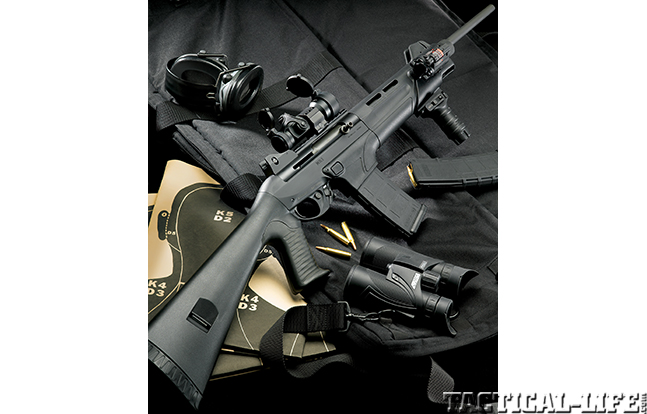 Available in both .223 Remington and .204 Ruger, the Evolution is a gas-operated semi-auto built on Volquartsen’s own CNC-machined stainless steel receiver with an integral Picatinny rail and a 20-inch, match-quality, 1-in-9-inch-twist barrel. My Evolution prefers mil-spec aluminum mags to the new polymer ones, and topped with Leupold’s 3-9x40mm VX-R Patrol scope, the Evolution is a real beast with 55-grain .223 Remington ammo, popping empty shotgun shells at 50 meters. Not inexpensive at an MSRP of $2,700 with its distinct I-fluted barrel, carbon-fiber-style stock and forward-blow compensator, the Evolution is alone in its firearms class. It’s a true match-grade, 5.56mm semi-auto that will gladly feed from STANAG magazines. (volquartsen.com; 712-792-4238)
