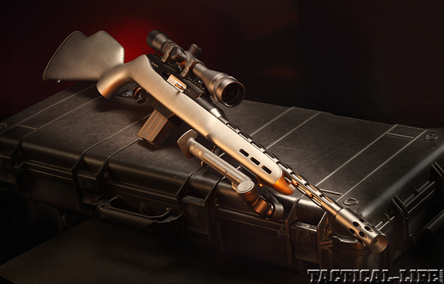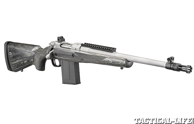 Based on the proven M77 Hawkeye action, the Ruger Gunsite Scout is a 16.5-inch-barreled bolt action in 7.62mm NATO with a three-position safety, a stainless steel bolt, a barrel-mounted scope rail, iron sights and a Mini-14-style flash suppressor. With a gray laminate stock, a rubber recoil pad and spacers to adjust the length of pull, the Scout is a compact, quick-handing brush gun. Ruger ships the gun with one 10-round magazine. Although Ruger sells these magazines in three-, five-and 10-round capacities on shopruger.com, they are the same pattern as AICS magazines. The Ruger versions sell for less than AI-marked magazines. With a street price in most gun stores under $1,000, the Ruger Gunsite Scout is a bargain for the quality, accuracy and reliability you’ll get. (ruger.com)