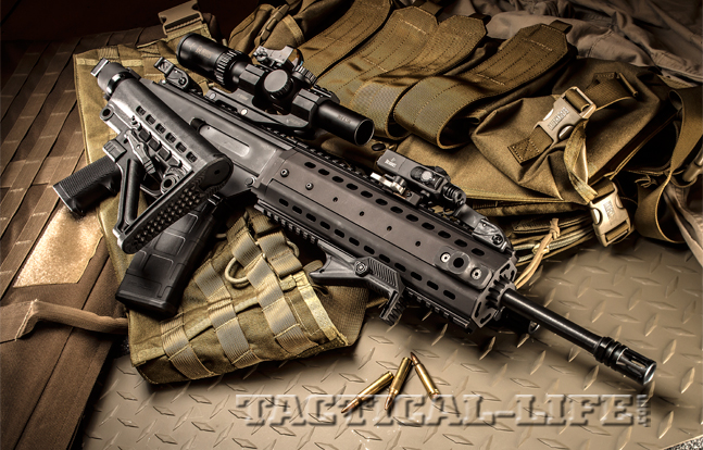 Internally, the operating system is quite different from a direct-impingement AR-15 and features a side-mounted charging handle. In contrast to the AR-15’s, the non-reciprocating MPAR charging handle allows the right-handed shooter to manipulate it without having to move the gun from the shoulder or remove his hand from the pistol grip. It also serves as a bolt forward assist.