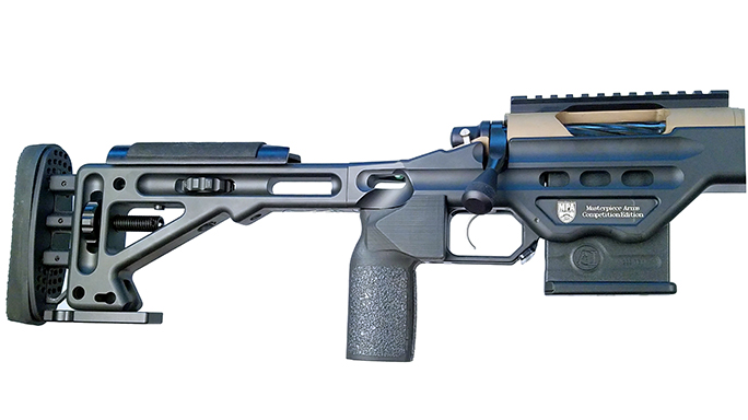 The rifle chassis is machined to exacting tolerances from 6061 aluminum. In addition, its weight is reduced and its structural integrity is boosted thanks to MPA’s unique pocketing system. The chassis also features a built-in bubble level, thumb notch, night vision bridge, lower mounted Picatinny rail and MPA Enhanced Vertical Grip. It’s also compatible with a user-locatable barricade stop system, which requires that you buy the optional MPA BA Rotating Barricade Stop.