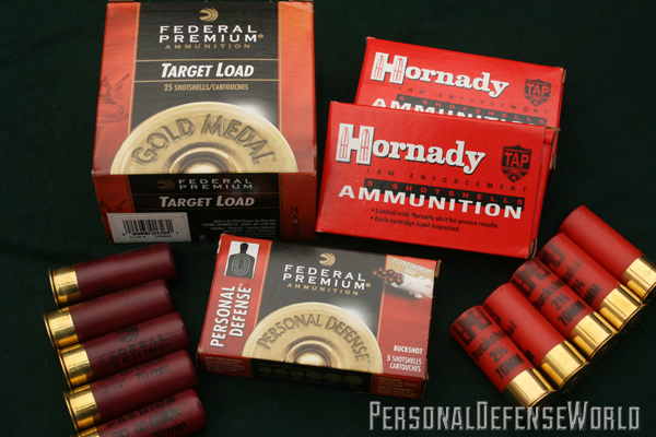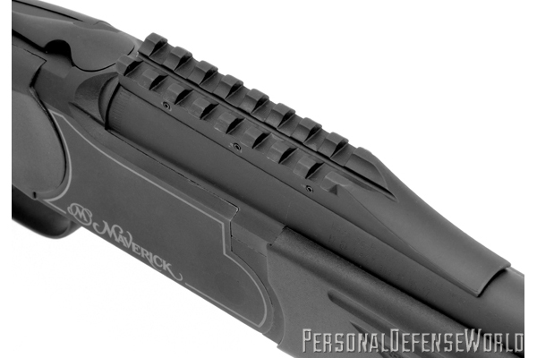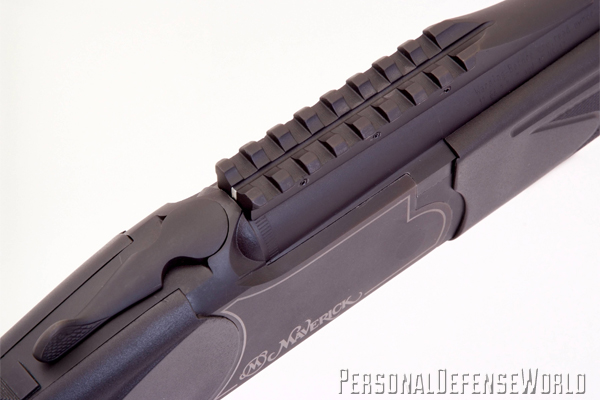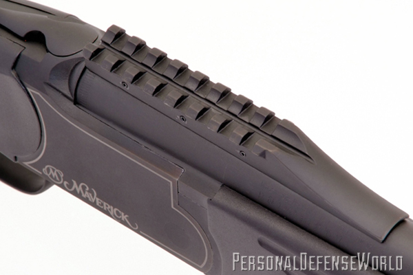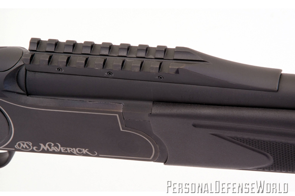 The HS12 is a hinge-action, double-barreled shotgun with 18.5-inch tubes, an overall length of 36.5 inches and a weight of 6.25 pounds empty. The forend and stock are black polymer with a rubber recoil pad at the butt. The metal finish is a matte blue. To make the HS12 attractive to the home-defense crowd, Maverick has installed an accessory rail on the top of the receiver and another out front, just under the lower barrel. The top rail forms a rear-sight channel and a front-sight blade is fixed to the upper barrel at the muzzle. An orange piece of fiber-optic material is fitted into the front-sight post. The HS12 has a single two-stage trigger that ignites both barrels consecutively. A tang-mounted safety is located just behind the action lever—back for “safe,” forward for “fire” and the switch also operates as a barrel selector. With the safety switch in the “safe” position you can slide it left or right, exposing either the “O” (over) or “U” (under). The letter that is exposed represents the barrel that fires first. Two varieties of the HS12 are available: the Model 75447 with two cylinder bore barrels and the Model 75449 with an improved cylinder top barrel and a modified bottom barrel. I tested the 75447 with twin cylinder-bore barrels…