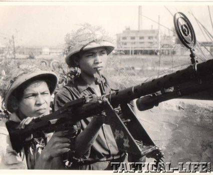 The Combloc Pulemet Kalashnikova (PK) series machineguns were designed under the supervision of Mikhail Timofeyovich Kalashnikov and employ an ingenious inverted adaptation of the basic Kalashnikov rifle action. The PKS (Stankovy) fires from an integral bipod. The PKT version is adapted for use in armored vehicles. The PK series of guns has been distributed via the same legal and illicit arms-distribution systems that have supplied the world’s dictators, warlords, totalitarian ideologues and malevolent militarized children with more than 100 million Kalashnikov assault rifles. As with the MAG and MG-3, the basic PK chassis has been adapted to countless tactical configurations.