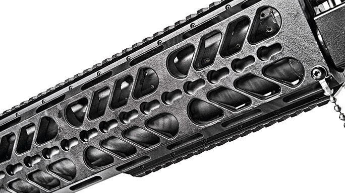 The bolt has left and right lugs on the back, too, but these aren’t to lock it in battery—in fact, it’s just the opposite. The lugs match up with corresponding cuts in the bolt carrier. When the rifle fires, the bolt carrier is knocked backward a short distance by a gas-driven piston. On its way back, the carrier notches grab the bolt lugs and lift the rear of the bolt up, unlocking it. Once unlocked, the action becomes in essence a blowback system, and the rearward inertia of the cartridge case and the remaining gas pushes the bolt and carrier backward, past a removable ejector slotted into the lower receiver.