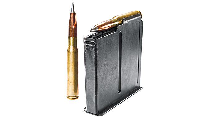 In testing, the magazine twice demonstrated a failure to feed the sharply pointed Hornady A-MAX match ammunition, but only on the third round. Rounds one through two and four through five fed fine on these two occurrences. I suspect some minor adjustment in the magazine’s internals may be in order. The angle of the third round put the point right into the lower flat of the barrel chamber. Care must also be taken to install the magazine correctly. It tilts in like an AK-47’s rather than sliding in like an AR-15’s.
