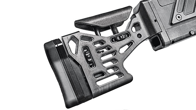 The buttstock is removable for transport and attaches with a single pin that locks it solidly onto a massive dovetail on the rear of the receiver. The adjustable stock uses ball-detent-