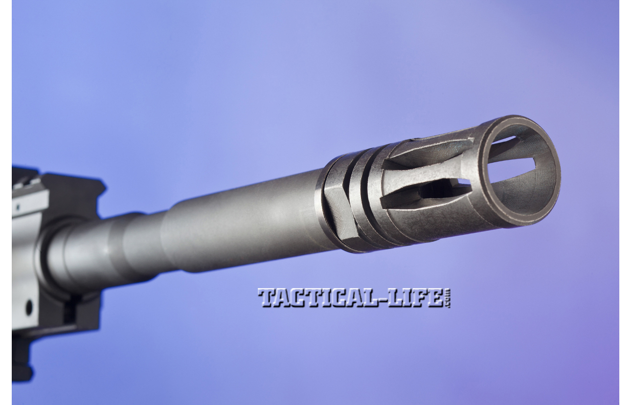 The Mod 1’s barrel is tipped with an A2-style flash hider, which is mounted via the most widely used .62 x 24 threads-per-inch attachment for .30-caliber suppressors. The barrel measures 16 inches and is rifled with a 1-in-10-inch right-hand twist. To smooth out machining tool marks, the chrome-moly vanadium and chrome-lined barrel was twice lapped. Externally, the barrel features an M203 step-down contour and a manganese phosphate finish to withstand the rigors of mil-spec salt fog test protocols.