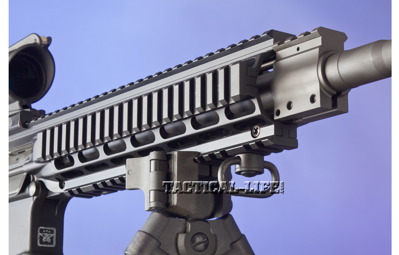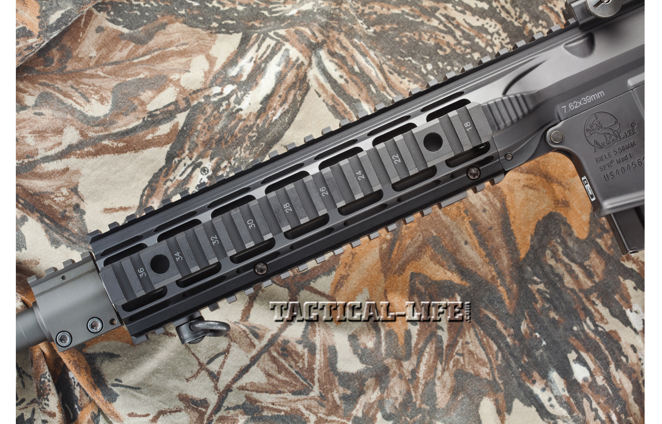 A nice finishing touch to the handguard is its swivel mounting positions. An inch from the front and rear of the top and left side rail section are flush-cup swivel mounting holes. These will allow you to mount your sling in a traditional muzzle-up transport position or lay the weapon flat when slung across your back in a muzzle-down carry. These are just two carry methods, since your sling mounting preferences may vary.